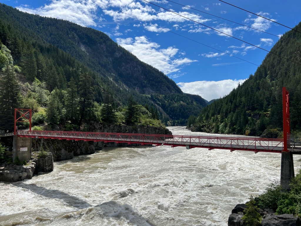 Unterwegs haben wir uns einen kleinen Abstecher zum Hell’s Gate im ehemaligen Goldgräbertal gegönnt, in dem die doppelte Menge an Wasser wie an den Niagara Fällen durch eine Verengung der Felswände fliesst!! 😮 Es gibt Fischtreppen, damit die Lachse über diesen Teil des Flusses (Fraser River) hinauf schwimmen können.